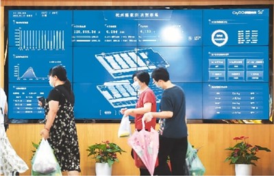 浙江省杭州市的5G農(nóng)貿(mào)市場(chǎng)——駱家莊農(nóng)貿(mào)市場(chǎng)的大屏幕上實(shí)時(shí)顯示交易、客流等相關(guān)情況。新華社記者 韓傳號(hào)攝