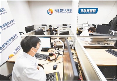 天津醫(yī)科大學(xué)總醫(yī)院互聯(lián)網(wǎng)醫(yī)院開(kāi)通“互聯(lián)網(wǎng)門診”服務(wù),醫(yī)生用手機(jī)視頻進(jìn)行線上問(wèn)診。新華社記者 李 然攝