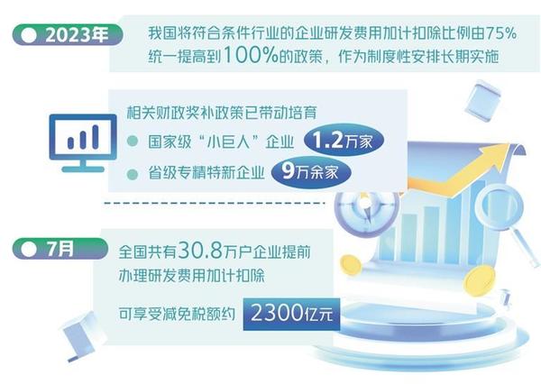 “為切實(shí)保證這一新的惠企政策落實(shí)到位,稅務(wù)部門(mén)依托稅收大數(shù)據(jù)篩選符合條件的企業(yè),定向開(kāi)展政策精準(zhǔn)推送和宣傳輔導(dǎo),確保企業(yè)‘知曉政策’;會(huì)同科技部門(mén)及時(shí)發(fā)布《研發(fā)費(fèi)用加計(jì)扣除政策執(zhí)行指引2.0》,細(xì)化政策口徑,確保企業(yè)‘會(huì)用政策’;第一時(shí)間優(yōu)化升級(jí)征管系統(tǒng),改進(jìn)電子稅務(wù)局功能,讓納稅人‘足不出戶’即可快捷辦理,確保企業(yè)‘用好政策’?!眹?guó)家稅務(wù)總局新聞發(fā)言人、辦公廳主任黃運(yùn)介紹。從7月份政策落實(shí)情況看,全國(guó)共有30.8萬(wàn)戶企業(yè)提前辦理研發(fā)費(fèi)用加計(jì)扣除,可享受減免稅額約2300億元。