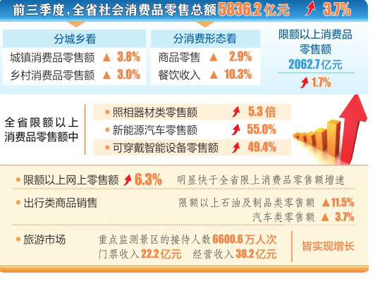 前三季度,全省消費(fèi)呈現(xiàn)哪些特點(diǎn)。據(jù)省統(tǒng)計(jì)局相關(guān)負(fù)責(zé)人介紹,新型消費(fèi)快速增長,全省限額以上消費(fèi)品零售額中,照相器材類零售額增長5.3倍,新能源汽車零售額增長55.0%,可穿戴智能設(shè)備零售額增長49.4%。限額以上網(wǎng)上零售額增長6.3%,明顯快于全省限上消費(fèi)品零售額增速;出行類商品銷售帶動(dòng)明顯,全省限額以上石油及制品類零售額增長11.5%,汽車類零售額增長3.7%;旅游市場持續(xù)回暖,全省重點(diǎn)監(jiān)測(cè)景區(qū)接待人數(shù)6600.6萬人次,門票收入22.2億元,經(jīng)營收入38.2億元,皆實(shí)現(xiàn)增長。