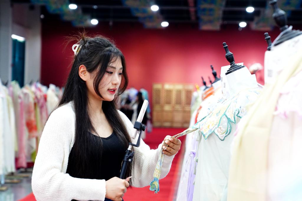 “85后”的黃曉燕曾在南方打拼十余年,如今成為曹縣穿越大唐漢服云倉經(jīng)理。“雖然是在鄉(xiāng)鎮(zhèn)工作,但貼近市場,節(jié)奏非??欤刻祛櫩徒j(luò)繹不絕。”她在展廳里邊走邊介紹,公司自主設(shè)計的漢服涵蓋唐、宋、明、清等品類,并根據(jù)人們?nèi)粘Vb特點加以改良。在這里,不僅能夠私人訂制服裝,還有AI直播改善線上消費體驗。