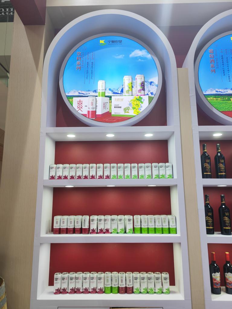 寧夏農(nóng)墾酒業(yè)有限公司在賀蘭山東麓國際葡萄酒交易會上展示的易拉罐裝葡萄酒。新華社記者 艾福梅 攝