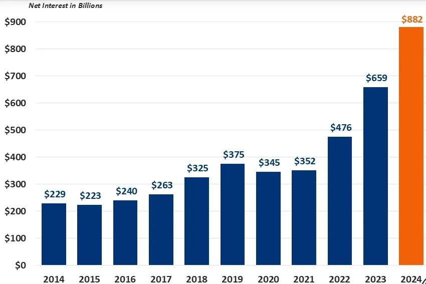 根據(jù)美國財政部11月20日公布的數(shù)據(jù),2024年美國聯(lián)邦政府僅用以償還美債利息的支出就達(dá)到了8820億美元。相較2023年6590億美元的利息支出,2024年美債利息支出增長率達(dá)33.8%。