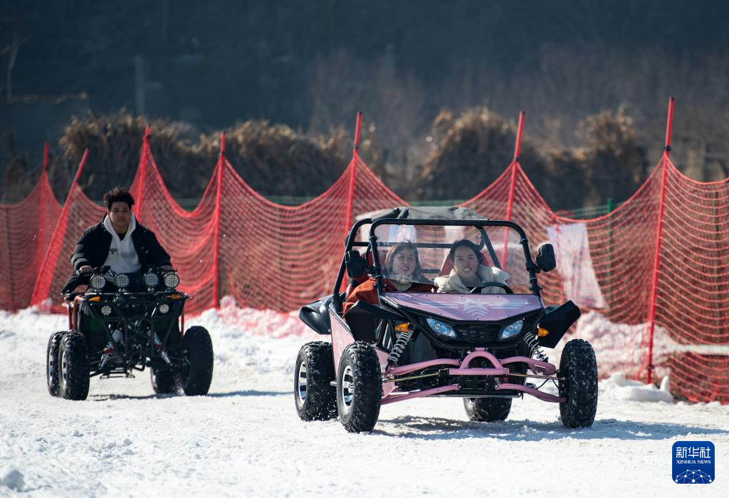 1月19日,在邯鄲市復興區(qū)東高河村滑雪場,游客在體驗雪地越野車項目。
