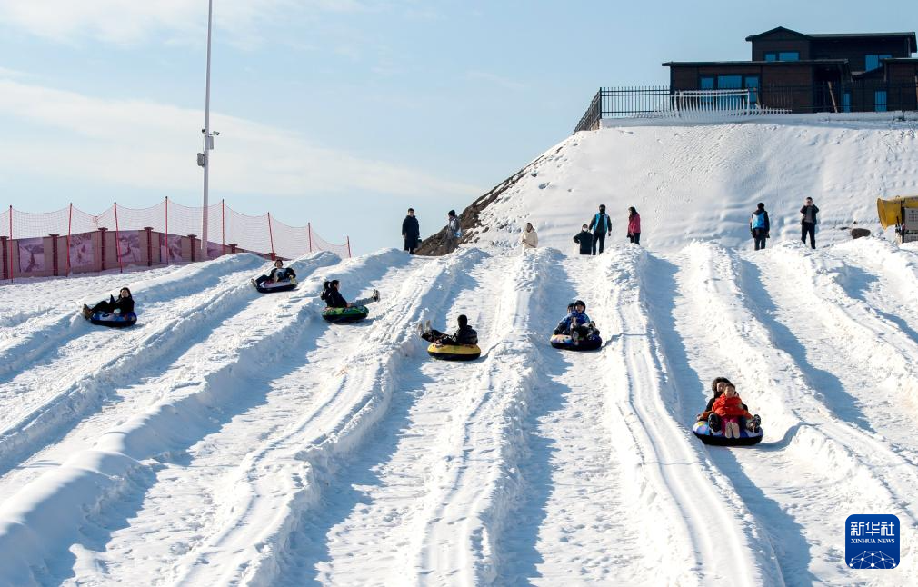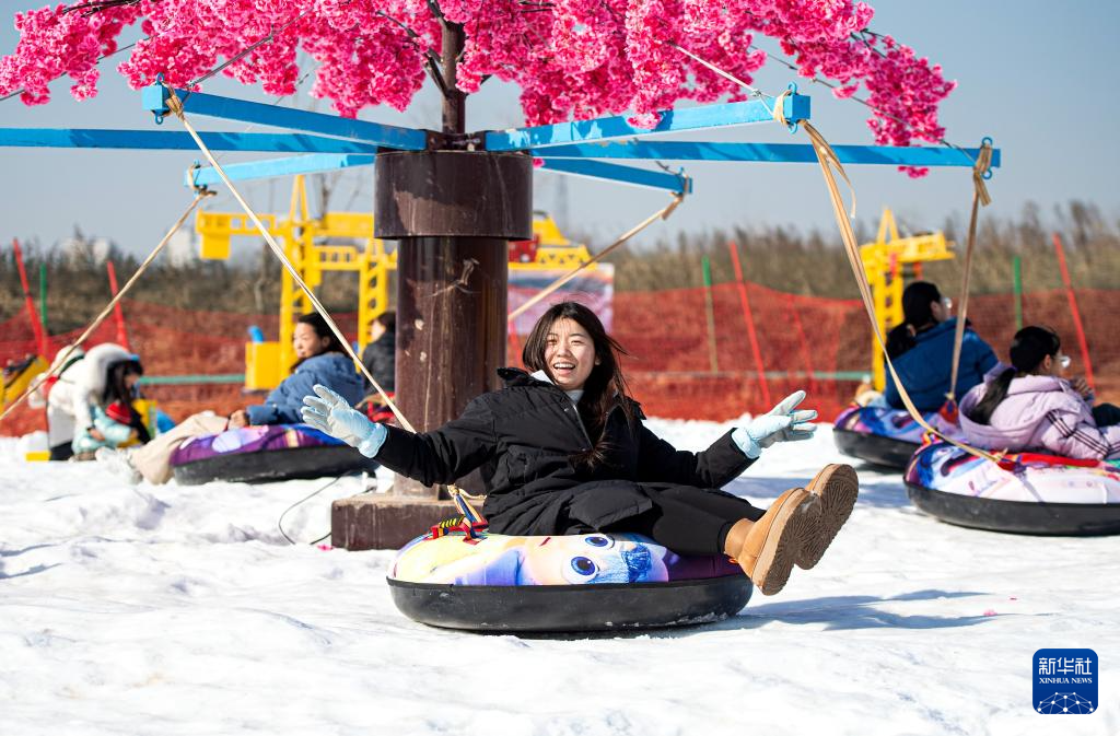 1月19日,在邯鄲市復興區(qū)東高河村滑雪場,游客在體驗滑雪圈項目。