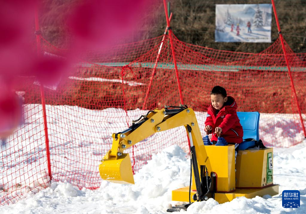 1月19日,在邯鄲市復興區(qū)東高河村滑雪場,小朋友在體驗雪地挖掘機項目。