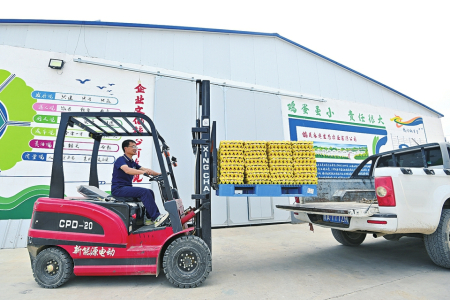 將檢驗合格的雞蛋平穩(wěn)裝車運往周邊超市。