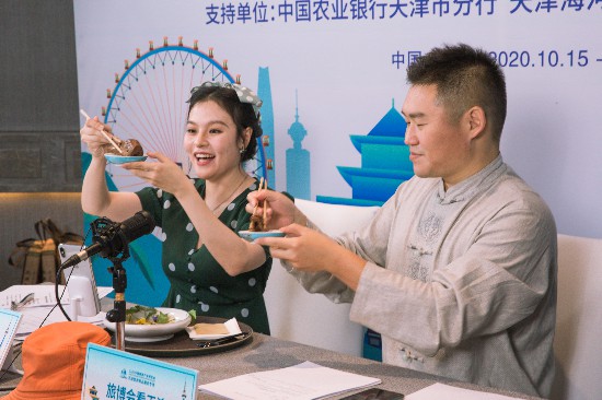 10月16日,在2020中國旅游產(chǎn)業(yè)博覽會(huì)上,主播通過直播推介美食。新華社發(fā)