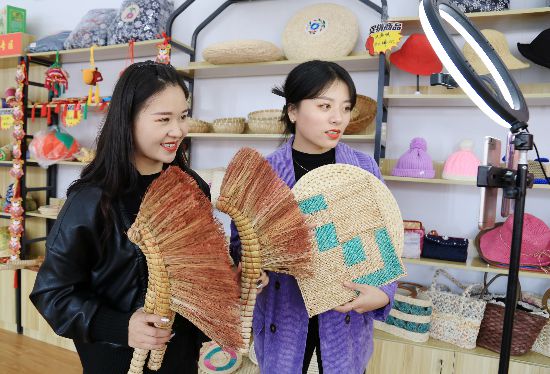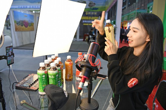 10月11日,甘肅隴南市西和縣消費(fèi)扶貧直銷店,供銷社工作人員正在直播帶貨拓展“線上”農(nóng)產(chǎn)品銷售。李旭春攝(人民視覺)