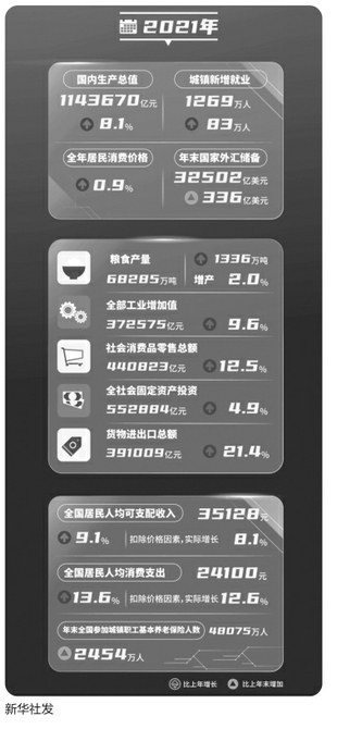 國(guó)家統(tǒng)計(jì)局2月28日發(fā)布的2021年國(guó)民經(jīng)濟(jì)和社會(huì)發(fā)展統(tǒng)計(jì)公報(bào)顯示,2021年,面對(duì)百年變局和世紀(jì)疫情,全國(guó)上下共同努力,我國(guó)經(jīng)濟(jì)發(fā)展和疫情防控保持全球領(lǐng)先地位,構(gòu)建新發(fā)展格局邁出新步伐,高質(zhì)量發(fā)展取得新成效,實(shí)現(xiàn)了“十四五”良好開(kāi)局。