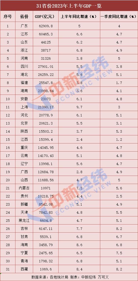 中新經(jīng)緯7月31日電 (萬可義)截至7月30日,31省份2023年上半年GDP數(shù)據(jù)已全部出爐。總量方面,粵蘇魯穩(wěn)居前三;增速方面,15省份高于“全國線”,上海勢頭最猛,增速達到9.7%。