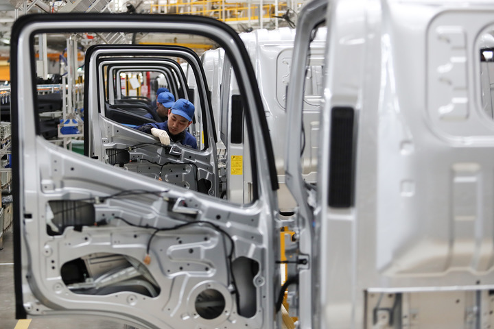 2024年1月8日,河南商丘首批地產(chǎn)新能源輕卡車(chē)下線,工人在組裝車(chē)間工作。新華社發(fā)