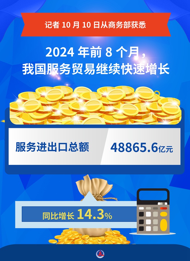 新華社北京10月10日電(記者謝?,帲┯浾?0日從商務部獲悉,今年前8個月,我國服務貿易繼續(xù)快速增長,服務進出口總額48865.6億元,同比增長14.3%。