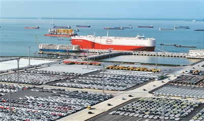 4月27日,搭載7000余輛比亞迪新能源商品車的汽車運輸船比亞迪“深圳”號首航駛往巴西,創(chuàng)下國內(nèi)汽車單次出口量一個批次最多的紀(jì)錄。圖為運輸船正在江蘇省蘇州港太倉港區(qū)裝載汽車。計海新攝(人民視覺)