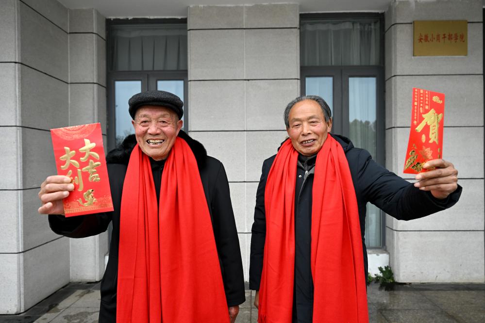 1月25日,在鳳陽縣小崗村,“大包干”帶頭人嚴(yán)金昌(左)和嚴(yán)宏昌展示自家領(lǐng)取的分紅紅包。新華社記者 黃博涵 攝