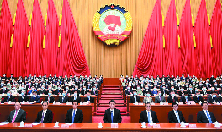 習近平、李克強、栗戰(zhàn)書、王滬寧、趙樂際、韓正、王岐山等在主席臺就座。