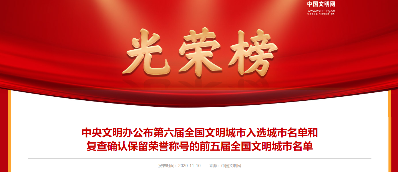 黨的十八大以來,全國各地堅(jiān)持以習(xí)近平新時(shí)代中國特色社會(huì)主義思想為指導(dǎo),深入學(xué)習(xí)貫徹習(xí)近平總書記關(guān)于加強(qiáng)社會(huì)主義精神文明建設(shè)的重要指示精神,增強(qiáng)“四個(gè)意識(shí)”,堅(jiān)定“四個(gè)自信”,做到“兩個(gè)維護(hù)”,大力培育和踐行社會(huì)主義核心價(jià)值觀,著力培養(yǎng)擔(dān)當(dāng)民族復(fù)興大任的時(shí)代新人,著力弘揚(yáng)共筑美好生活夢想的時(shí)代新風(fēng),不斷提升市民文明素質(zhì)、城市文明程度、城市文化品位、群眾生活質(zhì)量,不斷提高城市治理能力和治理水平,努力建設(shè)崇德向善、文化厚重、和諧宜居、人民滿意的文明城市,涌現(xiàn)出一批工作基礎(chǔ)扎實(shí)、創(chuàng)建成效突出、群眾滿意認(rèn)可、在全國具有示范作用的先進(jìn)典型。為全面展示文明城市創(chuàng)建豐碩成果,示范帶動(dòng)各地推進(jìn)城市物質(zhì)文明和精神文明協(xié)調(diào)發(fā)展,中央文明委今年評選表彰第六屆全國文明城市,并對前五屆全國文明城市進(jìn)行復(fù)查。 2020年8月以來,中央文明辦按照城市自主申報(bào)、省級擇優(yōu)推薦、中央部委審核、媒體集中公示、組織綜合測評、確定入選城市等評選辦法和程序,嚴(yán)謹(jǐn)規(guī)范組織第六屆全國文明城市評選工作,嚴(yán)格依據(jù)參評城市2018、2019、2020年三年測評總成績排名,提出第六屆全國文明城市入選城市名單,報(bào)中央文明委領(lǐng)導(dǎo)同志批準(zhǔn)。同時(shí),中央文明辦按照城市自查、省級審核、中央把關(guān)、組織測評等復(fù)查辦法和程序,認(rèn)真做好前五屆全國文明城市復(fù)查工作,嚴(yán)格依據(jù)全國文明城市復(fù)查測評成績,提出繼續(xù)保留榮譽(yù)稱號(hào)的全國文明城市名單,報(bào)中央文明委領(lǐng)導(dǎo)同志批準(zhǔn)。現(xiàn)將第六屆全國文明城市入選城市名單和復(fù)查確認(rèn)保留榮譽(yù)稱號(hào)的前五屆全國文明城市名單公布如下。 一、第六屆全國文明城市入選城市名單(133個(gè)) 省會(huì)城市(2個(gè)):云南省昆明市、甘肅省蘭州市。 直轄市城區(qū)(12個(gè)):上海市閔行區(qū)、天津市西青區(qū)、天津市北辰區(qū)、上海市崇明區(qū)、天津市濱海新區(qū)、重慶市合川區(qū)、上海市松江區(qū)、上海市金山區(qū)、上海市青浦區(qū)、重慶市沙坪壩區(qū)、重慶市涪陵區(qū)、北京市延慶區(qū)。 地級市(40個(gè)):湖北省十堰市、江蘇省鹽城市、浙江省金華市、浙江省衢州市、山東省濟(jì)寧市、陜西省延安市、江蘇省淮安市、山東省泰安市、浙江省舟山市、四川省德陽市、廣東省肇慶市、江蘇省連云港市、安徽省滁州市、河南省焦作市、江西省萍鄉(xiāng)市、云南省普洱市、湖北省鄂州市、河南省漯河市、河北省廊坊市、河南省南陽市、湖北省荊門市、吉林省吉林市、廣西壯族自治區(qū)桂林市、四川省自貢市、四川省眉山市、安徽省黃山市、湖南省郴州市、山西省晉城市、云南省曲靖市、河南省信陽市、安徽省宿州市、陜西省銅川市、四川省宜賓市、貴州省六盤水市、河南省商丘市、湖南省婁底市、福建省寧德市、江西省景德鎮(zhèn)市、山西省忻州市、安徽省阜陽市。 縣級市和縣(79個(gè)):浙江省德清縣、安徽省金寨縣、吉林省延吉市、山東省曲阜市、河南省林州市、江蘇省邳州市、江蘇省啟東市、河北省大廠回族自治縣、浙江省慈溪市、江蘇省海安市、浙江省嘉善縣、江蘇省昆山市、安徽省廣德市、浙江省海鹽縣、浙江省平湖市、浙江省安吉縣、江西省宜豐縣、湖北省枝江市、河南省新安縣、安徽省寧國市、山東省新泰市、湖南省寧鄉(xiāng)市、山西省靜樂縣、湖北省竹山縣、四川省都江堰市、安徽省歙縣、四川省米易縣、江蘇省句容市、浙江省臨海市、浙江省建德市、陜西省彬州市、河南省平輿縣、廣東省德慶縣、福建省上杭縣、貴州省凱里市、山西省古縣、江西省玉山縣、江蘇省太倉市、江蘇省如東縣、四川省閬中市、浙江省義烏市、陜西省吳起縣、浙江省嵊州市、吉林省通化縣、內(nèi)蒙古自治區(qū)杭錦旗、河北省文安縣、河南省柘城縣、江蘇省靖江市、貴州省仁懷市、山東省肥城市、山東省青州市、湖北省丹江口市、山東省昌邑市、重慶市巫溪縣、云南省景洪市、黑龍江省樺南縣、福建省福清市、山西省長子縣、廣東省仁化縣、山西省沁水縣、河南省汝州市、吉林省集安市、云南省石林彝族自治縣、河北省遵化市、山東省諸城市、四川省江油市、云南省楚雄市、河南省蘭考縣、江西省蘆溪縣、江西省大余縣、江蘇省高郵市、湖南省湘潭縣、廣西壯族自治區(qū)北流市、青海省玉樹市、云南省澄江市、福建省德化縣、新疆維吾爾自治區(qū)博樂市、安徽省桐城市、河南省新縣。 二、復(fù)查確認(rèn)保留榮譽(yù)稱號(hào)的前五屆全國文明城市名單(151個(gè)) 省會(huì)(首府)、副省級城市(24個(gè)):山東省濟(jì)南市、浙江省寧波市、江蘇省南京市、廣東省廣州市、浙江省杭州市、山東省青島市、福建省廈門市、湖北省武漢市、河北省石家莊市、廣東省深圳市、湖南省長沙市、江西省南昌市、貴州省貴陽市、四川省成都市、遼寧省沈陽市、海南省??