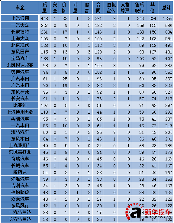 中消協(xié)2015汽車廠家被投訴具體數(shù)據(jù)排行榜(部分)