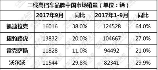 相比上月,9月的二線高檔車市似乎漲勢(shì)更甚。凱迪拉克、捷豹路虎、雷克薩斯、沃爾沃四家品牌9月銷量均超萬(wàn)輛,9月及前9月同比漲幅均超2位數(shù)。整體漲勢(shì)之下,二線高檔車市的排名趨勢(shì)愈發(fā)穩(wěn)定、清晰。然而,伴隨“神鋼”造假事件的不斷發(fā)酵,也為這一市場(chǎng)增添一大變數(shù)。