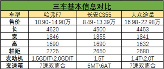 動力部分,途岳提供了1.4T+2.0T的發(fā)動機可供選擇,其中,1.4T發(fā)動機的最大馬力為150匹,峰值扭矩250N.m;2.0T發(fā)動機的最大馬力為186匹,峰值扭矩320 N.m,傳動方面,兩款發(fā)動機均匹配的是7速雙離合變速箱。單就動力參數(shù)來看,很明顯,今天推薦的三款車中,哈弗F7優(yōu)勢最大,途岳次之。但同樣拿出頂配的2.0T車型對比,途岳不僅配置不如哈弗F7,售價也要高上小十萬元。