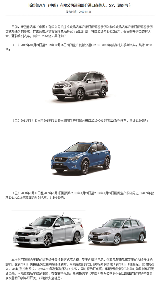 從召回原因來(lái)看,本月斯巴魯涉及132954輛汽車(chē)的召回不僅數(shù)量最大,召回原因也頗具“創(chuàng)意”。該批車(chē)輛因剎車(chē)燈開(kāi)關(guān)接觸方式不合理,受車(chē)內(nèi)清掃用品、化妝品等物品揮發(fā)出的含硅氣體的影響,在剎車(chē)燈開(kāi)關(guān)接觸點(diǎn)處生成絕緣薄膜時(shí),可能造成剎車(chē)燈開(kāi)關(guān)相關(guān)的功能(剎車(chē)燈、P檔解除、發(fā)動(dòng)機(jī)點(diǎn)火、VDC動(dòng)態(tài)控制系統(tǒng)、EyeSight駕駛輔助系統(tǒng))失效,同時(shí)警示燈點(diǎn)亮;車(chē)輛行駛過(guò)程中剎車(chē)時(shí)如果剎車(chē)燈無(wú)法點(diǎn)亮,可能造成后車(chē)追尾事故,存在安全隱患。