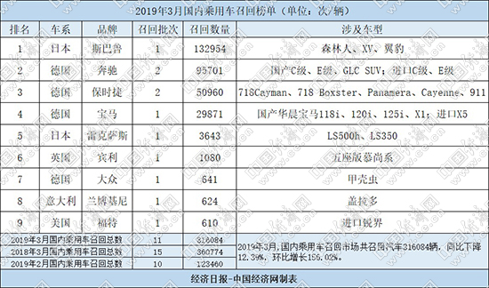 根據(jù)國(guó)家市場(chǎng)監(jiān)督管理總局缺陷產(chǎn)品管理中心3月份發(fā)布的召回公告,經(jīng)濟(jì)日?qǐng)?bào)-中國(guó)經(jīng)濟(jì)網(wǎng)汽車(chē)頻道經(jīng)過(guò)匯總、統(tǒng)計(jì),整理出“2019年3月國(guó)內(nèi)乘用車(chē)召回榜單”。3月,國(guó)內(nèi)乘用車(chē)市場(chǎng)共有9個(gè)品牌累計(jì)發(fā)布9起召回公告,共計(jì)召回汽車(chē)316084輛,同比下降12.39%,環(huán)比增長(zhǎng)156.02%。