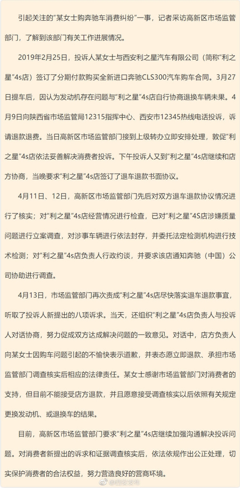 據(jù)西安市互聯(lián)網(wǎng)信息辦公室官方微博消息稱,4月13日,高新區(qū)市場監(jiān)管部門曾組織利之星4S店負責人與投訴人進行對話協(xié)商。對話中,店方負責人向奔馳女車主因購車問題引起的不愉快表示道歉,并表態(tài)愿立即退款、承擔市場監(jiān)管部門調(diào)查核實后相應(yīng)的法律責任。該奔馳女車主感謝市場監(jiān)管部門對消費者的支持,但目前不能接受店方退款,也愿意接受調(diào)查核實以后依照有關(guān)規(guī)定更換發(fā)動機、或退換車的結(jié)果。