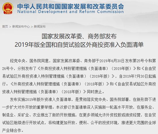 昨日,國(guó)家發(fā)展改革委、商務(wù)部連續(xù)發(fā)布了第25號(hào)令、第26號(hào)令和第27號(hào)令,分別發(fā)布了《外商投資準(zhǔn)入特別管理措施(負(fù)面清單)(2019年版)》(以下簡(jiǎn)稱《外資準(zhǔn)入負(fù)面清單》)、《自由貿(mào)易試驗(yàn)區(qū)外商投資準(zhǔn)入特別管理措施(負(fù)面清單)(2019年版)》(以下簡(jiǎn)稱《自貿(mào)試驗(yàn)區(qū)負(fù)面清單》)以及《鼓勵(lì)外商投資產(chǎn)業(yè)目錄(2019年版)》(以下簡(jiǎn)稱《外商投資目錄》)。
