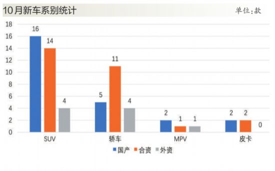 10月合資品牌推出的新車數(shù)量超過自主品牌。在轎車領(lǐng)域,合資產(chǎn)品仿佛回到了主場。其中在日系和德系車強(qiáng)勢的背景下,韓系車明顯加快了投放新品的節(jié)奏。據(jù)記者統(tǒng)計(jì),轎車中合資品牌共有菲斯塔、寶來純電等11款新車上市,而自主品牌僅有長安銳程CC等5款新車。一向以SUV市場為主陣地的自主品牌,10月推出長安CS35等16款車型,在SUV新車數(shù)量上,自主品牌僅比合資品牌多出兩款車型。而外資品牌推出的新車則主要分布在高端車和跑車領(lǐng)域,共有12款新車上市。