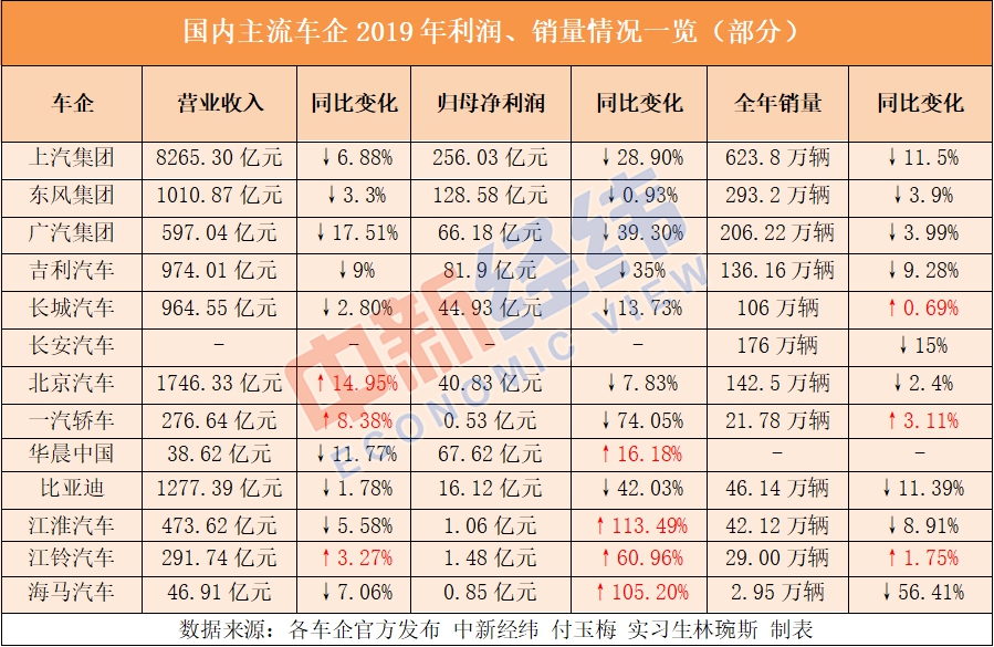 2019年車企成績(jī)單出爐,中新經(jīng)緯記者經(jīng)統(tǒng)計(jì)發(fā)現(xiàn),營(yíng)收、凈利雙降幾乎成了各大主流車企的趨勢(shì)。而少數(shù)逆勢(shì)扭虧為盈者,或因變賣資產(chǎn)、或因收巨額補(bǔ)貼等均非主業(yè)所得……梳理得知,市場(chǎng)疲軟及銷量下滑是車企對(duì)全年表現(xiàn)不盡如人意的普遍解釋。