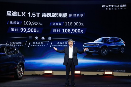 奇瑞汽車(chē)股份有限公司黨委書(shū)記、董事長(zhǎng)尹同躍現(xiàn)場(chǎng)宣布了一項(xiàng)“長(zhǎng)期福利”:即日起至10月31日,星途LX 1.5T乘風(fēng)破浪版限時(shí)售價(jià)9.99萬(wàn)元起、還可享CN95空濾免費(fèi)升級(jí)、首任車(chē)主基礎(chǔ)流量終身免費(fèi)、首任車(chē)主發(fā)動(dòng)機(jī)及變速箱核心零部件終身質(zhì)保“三免禮包”。