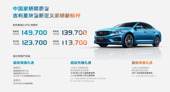 11月1日,吉利CMA超級(jí)母體首款寬體A級(jí)轎車——吉利星瑞于線上正式上市,新車全系標(biāo)配2.0TD+7DCT黃金動(dòng)力系統(tǒng),共推出4款車型,官方指導(dǎo)價(jià)為11.37萬-14.97萬元。