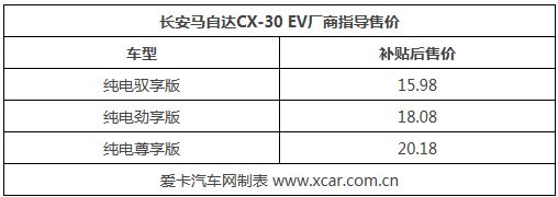 9月26日,長(zhǎng)安馬自達(dá)CX-30 EV正式上市,補(bǔ)貼后售價(jià)區(qū)間15.98-20.18萬(wàn)元。作為馬自達(dá)在華推出的首款純電車(chē)型,馬自達(dá)CX-30 EV的NEDC續(xù)航里程450km。