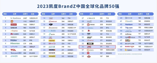 6月中旬,全球知名品牌排行榜凱度BrandZ攜手谷歌發(fā)布了《2023凱度BrandZ中國全球化品牌50強(qiáng)》榜單,江淮汽車位列中國全球化品牌第36位,相較2022年上升了4個(gè)名次,這是江淮汽車連續(xù)三年榮登該榜單,展現(xiàn)了持續(xù)、強(qiáng)勁的品牌增長勢頭。