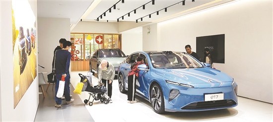 某蔚來空間體驗(yàn)店內(nèi),購車者正在體驗(yàn)新車