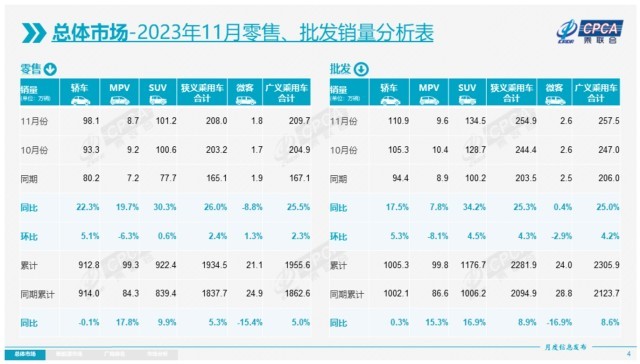 零售方面,據(jù)乘聯(lián)會統(tǒng)計(jì),2023年11月,乘用車市場零售達(dá)到208.0萬輛,同比增長26.0%,環(huán)比增長2.4%。今年累計(jì)零售1934.5萬輛,同比增長5.3%。