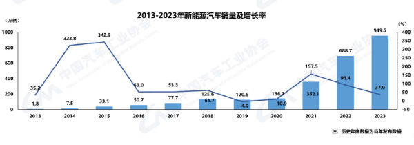 據(jù)中汽協(xié)統(tǒng)計(jì)分析,2023年我國(guó)新能源汽車產(chǎn)銷分別完成958.7萬輛和949.5萬輛,同比分別增長(zhǎng)35.8%和37.9%,市場(chǎng)占有率達(dá)31.6%。