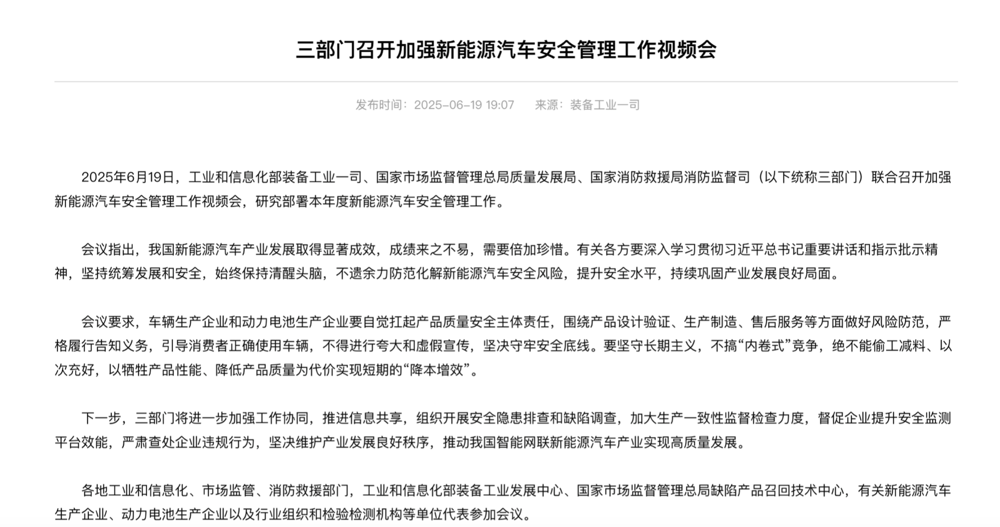 央廣網(wǎng)北京6月20日消息(記者董楠)6月19日,工業(yè)和信息化部裝備工業(yè)一司、國家市場監(jiān)督管理總局質(zhì)量發(fā)展局、國家消防救援局消防監(jiān)督司(以下統(tǒng)稱三部門)聯(lián)合召開加強新能源汽車安全管理工作視頻會,研究部署本年度新能源汽車安全管理工作。