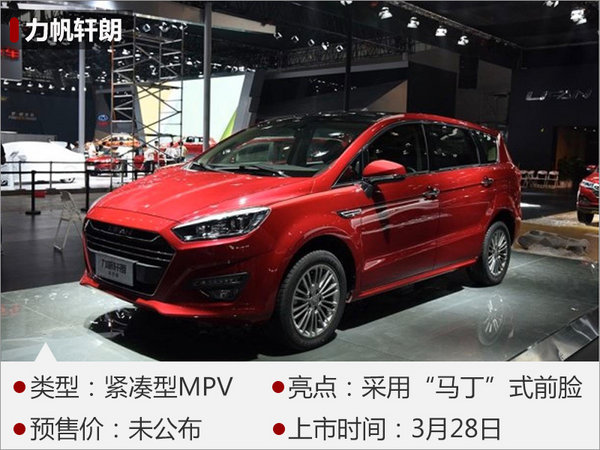 在2016年11月舉行的廣州國際車展上,力帆汽車對外發(fā)布了全新MPV—軒朗,其“馬丁”式前臉設(shè)計(jì)令人印象深刻,同時(shí)運(yùn)動化輪圈與下沉式車頂?shù)拇钆湟彩窍嗟靡嬲?。?nèi)飾方面,力帆軒朗以黑色為主,中控臺下方按鍵布局較為簡潔,實(shí)用性較高。力帆軒朗搭載了1.5L渦輪增壓和2.0L自然吸氣兩款發(fā)動機(jī),前者匹配的是8速自動變速箱或5速手動變速箱,后者則匹配的是5MT或CVT變速箱。新車將于3月28日正式上市。