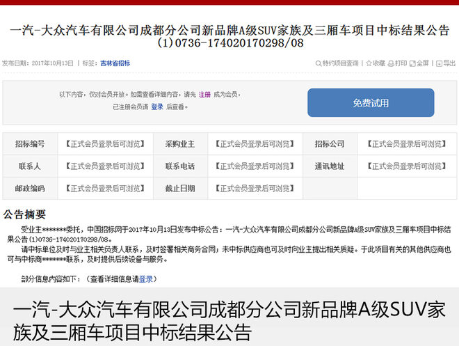 日前,中國招標(biāo)網(wǎng)正式公布了《一汽-大眾汽車有限公司成都分公司新品牌A級SUV家族及三廂車項(xiàng)目中標(biāo)結(jié)果公告》從公告上來看,一汽-大眾汽車有限公司正在成都工廠準(zhǔn)備新品牌A級SUV兩款車型以及另外一款三廂車項(xiàng)目。該項(xiàng)目主要用于投產(chǎn)一汽-大眾全新經(jīng)濟(jì)用車品牌,以滿足消費(fèi)者對廉價(jià)車的購買需求。