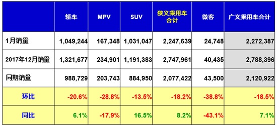具體車(chē)型方面,1月SUV和轎車(chē)的銷(xiāo)量環(huán)比均出現(xiàn)下滑,同比則大幅增長(zhǎng),這也是1月份乘用車(chē)市場(chǎng)實(shí)現(xiàn)開(kāi)門(mén)紅的主要?jiǎng)恿?;而MPV仍沒(méi)有復(fù)蘇的跡象,銷(xiāo)量同環(huán)比均出現(xiàn)下滑。