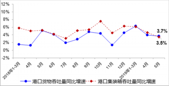 5月,全國(guó)港口完成貨物吞吐量12.0億噸,同比增長(zhǎng)3.7%,其中內(nèi)、外貿(mào)吞吐量分別增長(zhǎng)5.2%和0.9%;完成集裝箱吞吐量2240萬(wàn)標(biāo)箱,同比增長(zhǎng)3.5%。