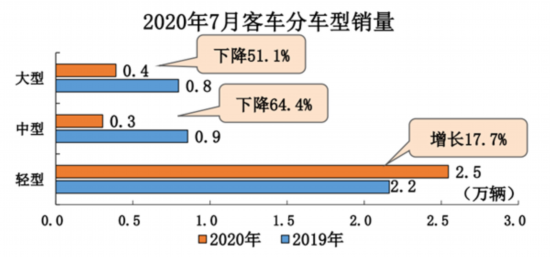 從細分車型來看,7月,大型客車銷0.4萬輛,環(huán)比下降37.7%,同比下降51.1%;1-7月,大型客車銷2.7萬輛,同比下降33.8%。中型客車銷0.3萬輛,環(huán)比下降27.0%,同比下降64.4%;1-7月,中型客車銷2.0萬輛,同比下降44.3%。輕型客車銷2.5萬輛,環(huán)比下降21.9%,同比增長17.7%;1-7月,輕型客車銷17.0萬輛,同比下降1.7%。