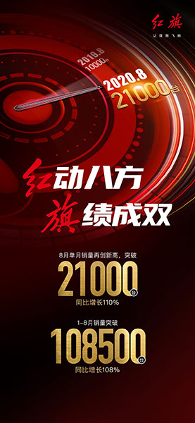 近日,紅旗對外發(fā)布8月銷售數(shù)據(jù)顯示:單月總銷量突破2.1萬輛,同比增110%,其中HS5單品月銷過萬。1-8月,紅旗累計銷量突破108500輛,同比增長108%,繼續(xù)書寫“新紅旗速度”。
