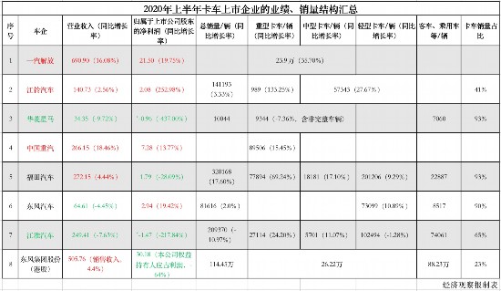 8月底,A股與H股共28家上市整車企業(yè)陸續(xù)發(fā)布了2020年半年度報(bào)告。經(jīng)濟(jì)觀察報(bào)記者通過統(tǒng)計(jì)對(duì)比發(fā)現(xiàn),乘用車企業(yè)與商用車企業(yè)的半年度業(yè)績(jī)呈現(xiàn)“冰火兩重天”的態(tài)勢(shì):絕大多數(shù)乘用車整車企業(yè)出現(xiàn)營(yíng)業(yè)收入、歸屬于上市公司股東凈利潤(rùn)雙下滑,而幾家主營(yíng)卡車業(yè)務(wù)的整車企業(yè)卻迎來高光時(shí)刻,實(shí)現(xiàn)增收又增利。 記者重點(diǎn)統(tǒng)計(jì)了一汽解放、江鈴汽車、華菱星馬、中國(guó)重汽、福田汽車、東風(fēng)汽車、江淮汽車、東風(fēng)集團(tuán)股份這8家以商用卡車業(yè)務(wù)為重點(diǎn)的整車企業(yè)。在這8家車企中,有6家企業(yè)的卡車銷量占比超過60%,有的則高達(dá)90%。 需要說明的是,東風(fēng)集團(tuán)股份是一家以乘用車為主業(yè)的公司,其卡車銷量占總銷量的比例只有23%,但由于卡車銷售收入占到了總銷售收入的40%,因此也計(jì)入本次統(tǒng)計(jì)中。另有一些整車企業(yè)雖然也發(fā)展卡車業(yè)務(wù),但由于銷量占比較小,如上汽依維柯紅巖的銷量只占上汽集團(tuán)總銷量的2%,對(duì)上市公司業(yè)績(jī)的影響也較為有限,因此不納入統(tǒng)計(jì)范圍。