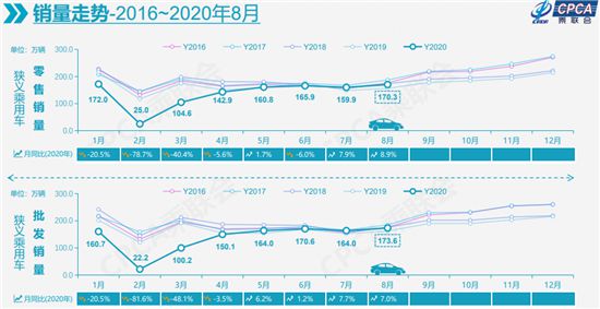 昨日(9月8日),乘用車市場信息聯(lián)席會(huì)發(fā)布數(shù)據(jù)顯示,8月,國內(nèi)狹義乘用車銷量達(dá)到170.3萬輛,同比增長8.9%,實(shí)現(xiàn)了自2018年5月以來的最強(qiáng)正增長。今年1-8月的零售累計(jì)增速下滑15.2%,較1-7月累計(jì)增速提升3.3個(gè)百分點(diǎn),體現(xiàn)出行業(yè)的快速回暖態(tài)勢。
