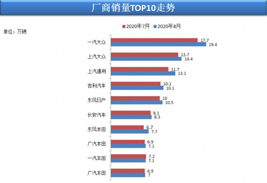根據(jù)乘聯(lián)會(huì)數(shù)據(jù)顯示,狹義乘用車(chē)廠(chǎng)商8月銷(xiāo)量排行,前五位分別一汽大眾、上汽大眾、上汽通用,吉利汽車(chē)、東風(fēng)日產(chǎn),銷(xiāo)量分別為19.4萬(wàn)輛、14.4萬(wàn)輛、13.1萬(wàn)輛、10.7萬(wàn)輛和10.5萬(wàn)輛。排名與7月相同,各廠(chǎng)商銷(xiāo)量均有所增長(zhǎng)。