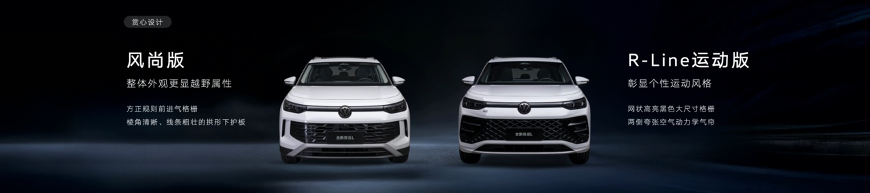 外觀(guān)造型上,為滿(mǎn)足當(dāng)下用戶(hù)多元化的審美需求,全新探岳L提供兩種前臉設(shè)計(jì)。其中,風(fēng)尚版車(chē)型的前臉?lè)秸乙?guī)則的進(jìn)氣格柵,輔以棱角清晰、線(xiàn)條粗壯的拱形下護(hù)板,整體外觀(guān)更顯越野屬性。相比之下,R-Line運(yùn)動(dòng)版則采用了品牌標(biāo)志性的網(wǎng)狀、高亮黑、大尺寸格柵,與兩側(cè)夸張的空氣動(dòng)力學(xué)氣簾相得益彰,賦予車(chē)輛更凌厲氣質(zhì),充分彰顯個(gè)性運(yùn)動(dòng)風(fēng)格。