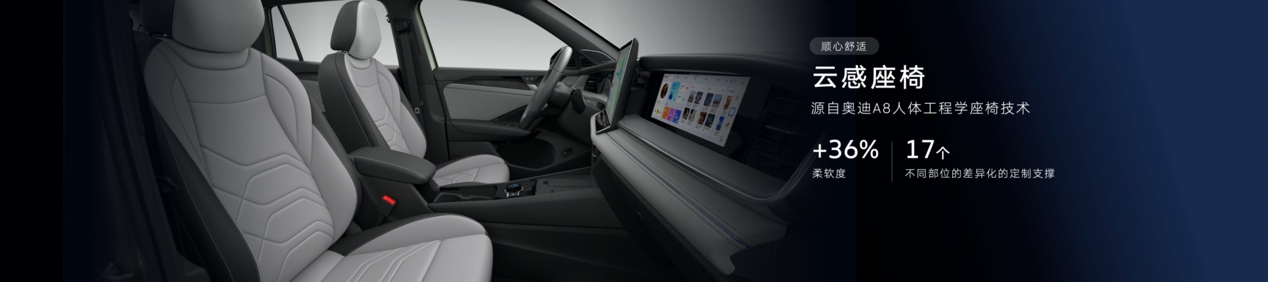 舒適體驗(yàn)上,全新探岳L配備了專(zhuān)為中國(guó)用戶(hù)研發(fā)的云感座椅,座椅柔軟度提升了36%,坐上去可以完全放松。除柔軟外,云感座椅還擁有Audi A8同款人體工學(xué)座椅設(shè)計(jì),提供身體從靠背到大腿共17處不同部位的差異化定制支撐,即使長(zhǎng)途駕駛也不感疲憊,讓更多用戶(hù)體驗(yàn)到越級(jí)的舒適。