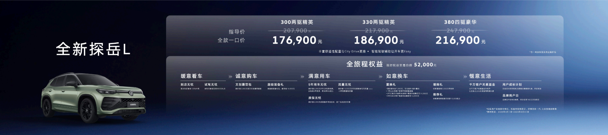 2018年至今,一汽-大眾SUV家族累計(jì)銷(xiāo)量已近200萬(wàn)輛,構(gòu)建了產(chǎn)品數(shù)量最多、覆蓋領(lǐng)域最廣、兼具油電的SUV產(chǎn)品矩陣。為感恩千萬(wàn)用戶(hù)一路同行,值明星SUV全新探岳L煥新之際,一汽-大眾還發(fā)布了全新IP“探山攬?jiān)馈保瞥隽巳绿皆繪的上市權(quán)益大禮包,覆蓋用戶(hù)看車(chē)、購(gòu)車(chē)、用車(chē)、換車(chē)等全旅程,總價(jià)值超5萬(wàn)元,誠(chéng)意滿(mǎn)滿(mǎn)。